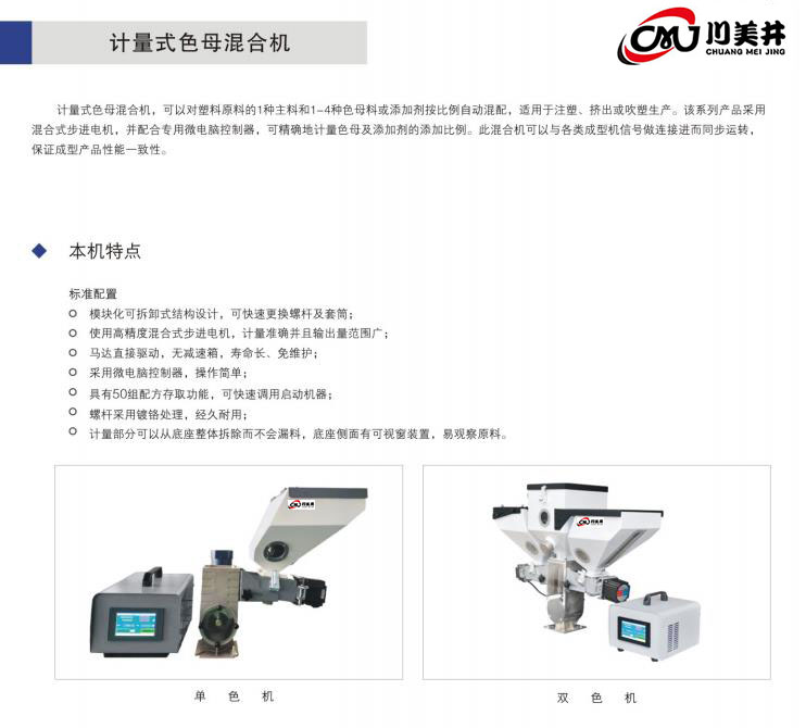 計(jì)量式色母混合機(jī),可以對(duì)塑料原料的1種主料和1-4種色母料或添加劑按比例自動(dòng)混配,適用于注塑、擠出或吹塑生產(chǎn)。該系列產(chǎn)品采用混合式步進(jìn)電機(jī),并配合專用微電腦控制器,可精確地計(jì)量色母及添加劑的添加比例。此混合機(jī)可以與各類成型機(jī)信號(hào)做連接進(jìn)而同步運(yùn)轉(zhuǎn),保證成型產(chǎn)品性能一致性。